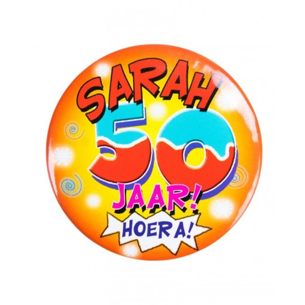 Deze Sarah button heeft een afbeelding met Sarah 50 jaar! Hoera!