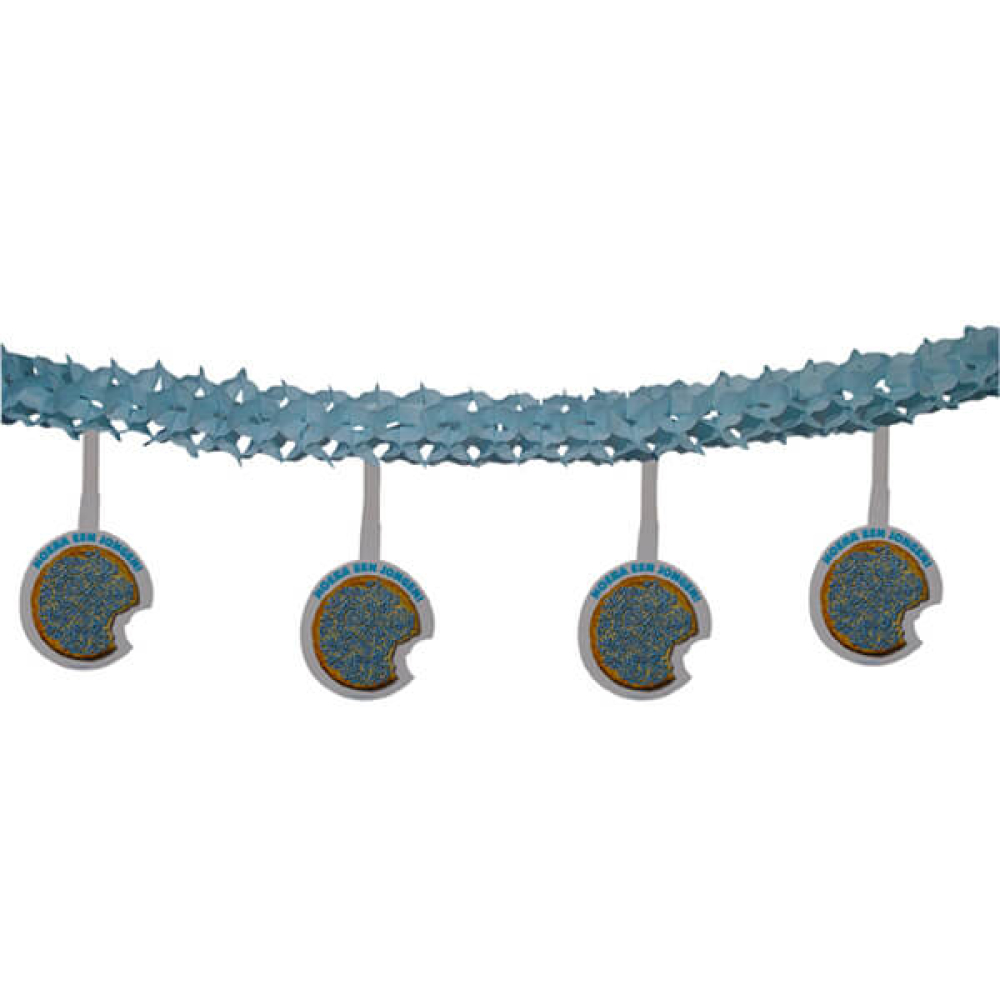 Een slinger met eronder hangende beschuit met muisjes in de kleur blauw.Op het beschuitje staat ook nog de tekst vermeld: Hoera een jongen!