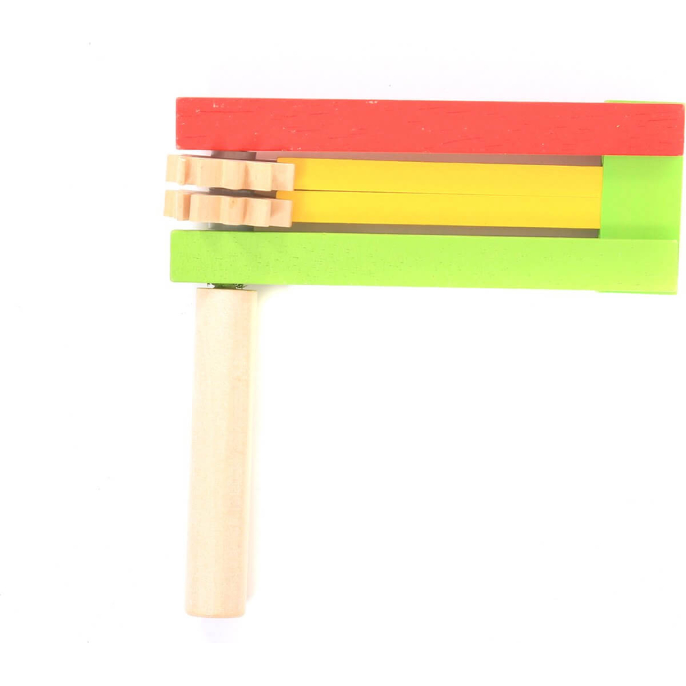Dubbele ratelaar van hout in leuke fleurige kleuren.