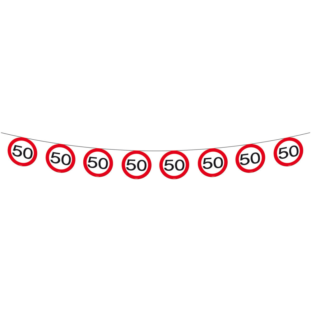 Een vlaggenlijn met verkeersborden. Op ieder vlaggetje staat een verkeersbord afgebeeld met daarin het getal 50.